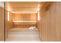 Fínska sauna radu Auroom LIBERA s rozmermi 120x180 cm s celopresklennou prednou stenou. Sauna je vyrobená z osikového dreva, ktoré je spracované pomocou tepelnej úpravy tzv. Thermowood.