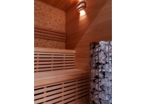 O vykurovanie sauny sa starajú saunové kachle Harvia Cilindro PC90, ktoré majú tvar valcového koše, do ktorého sa zmestí až 80 kg saunových kameňov. Nielen vďaka tomuto množstvo možno regulovať povahu saunovania. Polievaním konkrétnej časti kachlí možno ovládať prudkosť odparení vody. Kamene v hornej časti piliera sa totiž zahrievajú na vyššie teploty ako v nižšej časti, čo ovplyvňuje rýchlosť a intenzitu odparovania. Saunové kachle sú vyrábané výhradne z nehrdzavejúcich kovov. Tento model je vhodný k častejšiemu polievanie vodou a sú ovládané priamo na plášti.