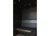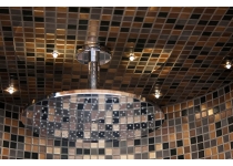 Okrúhly kryštál vytvára jemné a harmonické svetlo, ktoré dopĺňa moderný vzhľad v interiéri sauny.