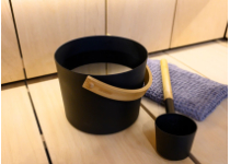Elegantné vedro do sauny je vyrobené z nerezovej ocele v kombinácii s drevom. Moderný dizajn s čiernou matnou povrchovou úpravou.