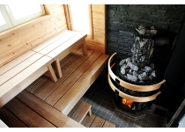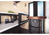 Ohrádka je navyše vybavená osvetlením, ktoré bezpečnostný prvok menia na veľmi ľúbivý dekoračné element v saune.