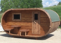 Nezvyklým a zaujímavým riešením saunového domčeku je táto oválna sauna určená pre umiestnenie vonku. Vnútri ukrýva dve miestnosti - jednu odpočinkovú a jednu pre samotné saunovanie, do ktorej sa zmestia 3-4 osoby. Pri vstupe sa navyše nachádza malá terasa.