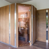 Sauna s nerezovými pásmi je naším novým refenčním projektom v moravskej dedine Česká. Sauna je obložená širokými obklady z dreva jelša v úprave thermowood. Tieto širšie palubovky sú teraz vyhľadávanú, moderné variantom obkladov. Niekedy majú označenie "rustikal". Zákazník mal k dispozícii priestory domácej posilňovne a saunou ju rozšíril na malé wellness. Naša firma dodáva rôzne atypické a vstavané sauny na mieru, ktoré majú napríklad šikmé steny (stropy), presklenie pod. Takéto sauny vyrábame maximálne prispôsobené danému priestoru. Vstavané sauny vyrábame do vopred pripraveného (napríklad len vymurovaného) priestoru.