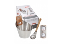 Prémiový set saunového príslušenstva od Harvie - tie najluxusnejšie doplnky do sauny, aké môže Fínsko ponúknuť. Nerezové prevedenie v kombinácii s Termojelšou. Vedro má objem 5,5 litrov, naberačka 0,2 litra. Teplomer s vlhkomerom sú umiestnené pod sebou, s dvojitou stupnicou (vonkajšia rada desiatky, vnútorná medzistupne).