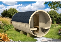 Sauna o dvoch miestnostiach s príjemnou terasou v sebe ukrýva ako saunu tak i odpočiváreň. Sudové sauna až pre 4-6 osôb. Prevedenie smrek. Vhodné pre kachle elektrická aj na drevo. Sauna je dodávaná vrátane lavíc, podlahy, šindle, ventilácia, sklenených alebo drevených dverí, oken (4x), ozdobného lemu, nerezové obruče, troch podpier a odkloněného ukončenie strechy po stranách. Rozmery: 4000x2050.