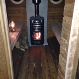 Sauna je vyrobená z termoborovice, potné miestnosť je ideálna na ležanie dvoch osôb či sedenie pre 4, sauna je zozadu osadená guľatými okienkami, predná časť je doplnená odpočívacou verandou. Kachle Harvia M3 sa postarajú o vyhriatie sauny za 40 minút, sklenený priehľad v kachliach sa postará o atmosféru. Do sauny nie je privedené svetlo, to zabezpečuje okrem priehľadu v kachliach petrolejka, aby sa sauna čo najviac blížila formáte tradičné fínske sauny.