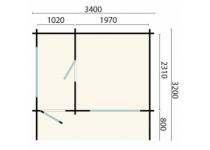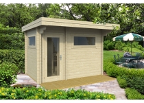 Vonkajšia sauna Timo s rozmermi 320x340cm s vonkajšou terasou a vstupnou miestnosťou, hrúbka stien 70mm.