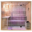 Len pre e-shop. Sauna Family L predstavuje plne vybavené riešenie pre domácu relaxáciu. Tento model s rozmermi 1960 x 1890 x 2040 mm ponúka dostatok priestoru pre pohodlné využitie až piatimi osobami. Obsahuje výkonné kachle sentiotec 190E s výkonom až 9 kW, riadiacu jednotku Pro D2i a ovládací panel pre infračervený žiarič. Súčasťou je aj integrované RGBW-LED osvetlenie, ktoré vytvára príjemnú atmosféru a umožňuje prispôsobiť farbu svetla podľa nálady. Kabína je vyrobená z masívneho smrekového dreva s interiérom z lipy, doplnená o tri široké lavice a bezpečnostnú ohrádku okolo kachlí. Sklenené dvere a panely z tvrdeného skla dodávajú saune moderný a elegantný vzhľad, zatiaľ čo kvalitné materiály a robustná konštrukcia zaisťujú dlhú životnosť a spoľahlivú prevádzku.